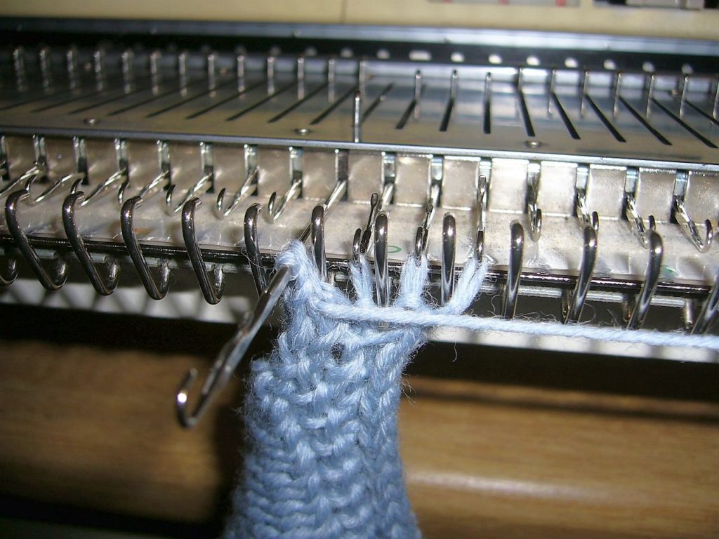 4 Maschen vom Rand am Eck beginnend in die Nadeln einhängen, Schlitten befindet sich rechts, Ein mal hin und her fahren, dann die nächste Randmasche auf die äußere linke Nadel dazuhängen, wieder hin und her schieben usw., siehe Bilder.