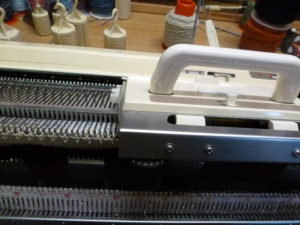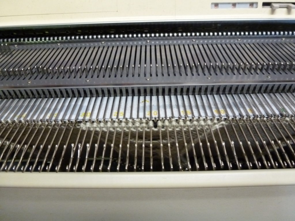 Geschafft! Alle Nadeln zum sicheren Abstricken in E bringen, Nadelrückholer auf N und nun kann das Teil nach der Kellerfalte fertig gestrickt werden.